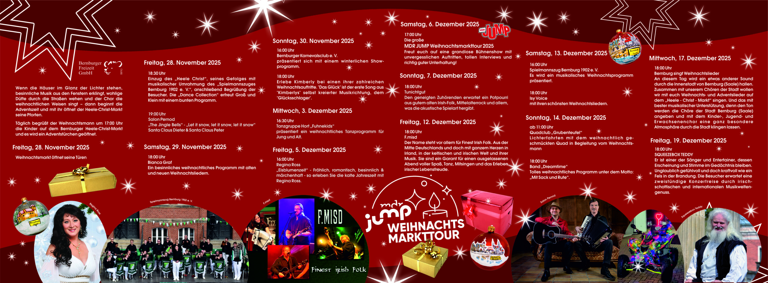 Am Freitag, 28. November 2025 um 18:30 Uhr wird der Markt feierlich durch den Heelen Christ und den Spielmannszug Bernburg 1902 e. V. eröffnet – Gänsehaut garantiert! Musikalisch erwartet euch während der gesamten Zeit eine bunte Mischung: klassische Weihnachtsklänge, irische und schottische Musik, Auftritte des Bernburger Karnevalsclubs, von Manuel Richter und der Band „Die Tagelöhner“.