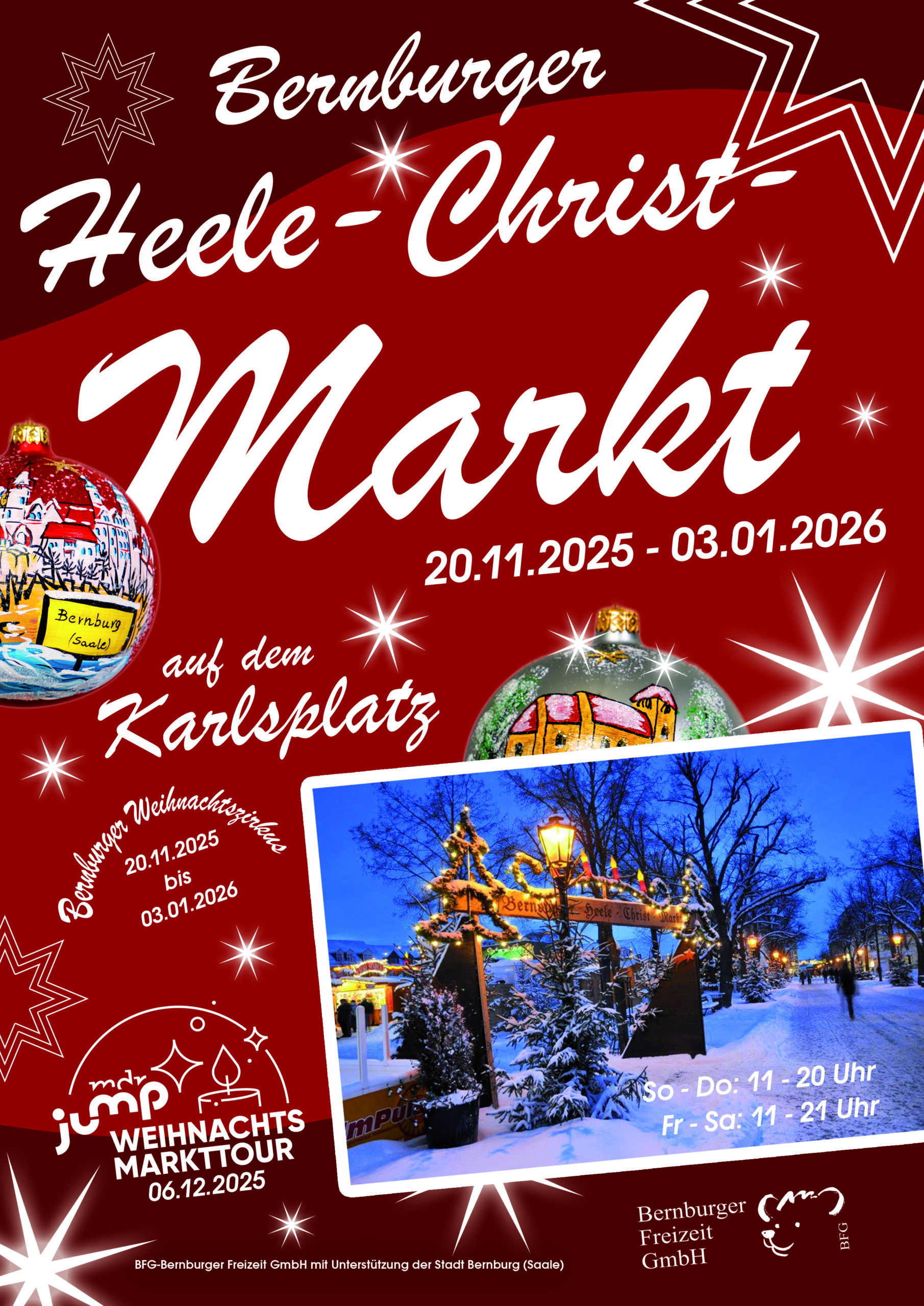 Vom 20. November 2025 bis 3. Januar 2026 lädt der traditionsreiche Bernburger Heele-Christ-Markt zu einer märchenhaften Reise in die Weihnachtswelt ein.