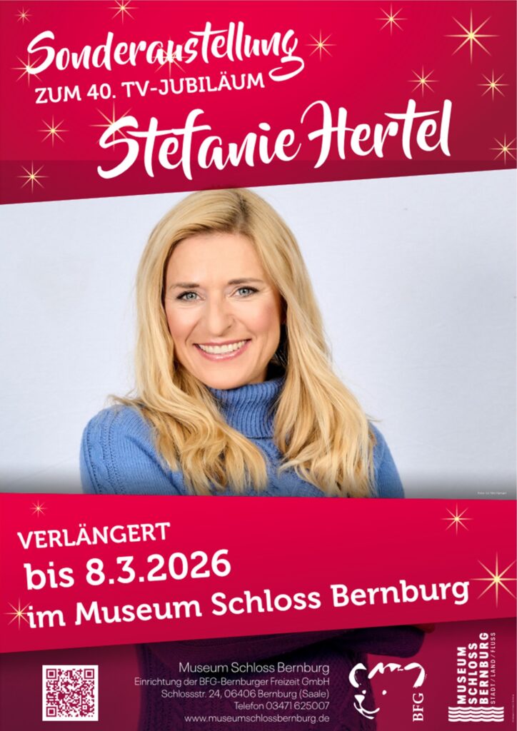 Vom 6. Dezember 2025 bis zum 8. März 2026 erwartet Sie im Museum Schloss Bernburg eine ganz besondere Sonderausstellung zum 40. Jubiläum der beliebten Sängerin Stefanie Hertel. In Kooperation mit der BFG-Bernburger Freizeit GmbH wird die Sonderausstellung das bewegte Leben der Künstlerin würdigen – von ihren Anfängen als Kinderstar bis hin zu ihrem heutigen Status als etablierter Show-Profi.