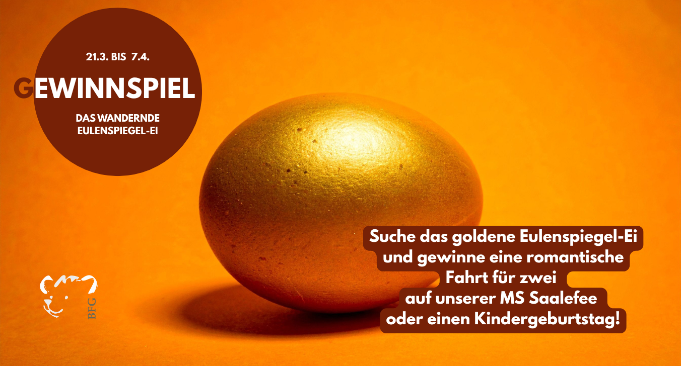 Wer das goldene Ei an seinem aktuellen Standort entdeckt, macht ein Selfie mit dem Ei im Hintergrund. Wird dieses Foto auf Instagram oder Facebook mit den Hashtags #BernburgerMomente und #EulenspiegelEi gepostet und der Account der BFG markiert, landet es im großen Oster-Lostopf. Als Hauptpreis winkt eine romantische Fahrt auf der Saalefee für zwei Personen.