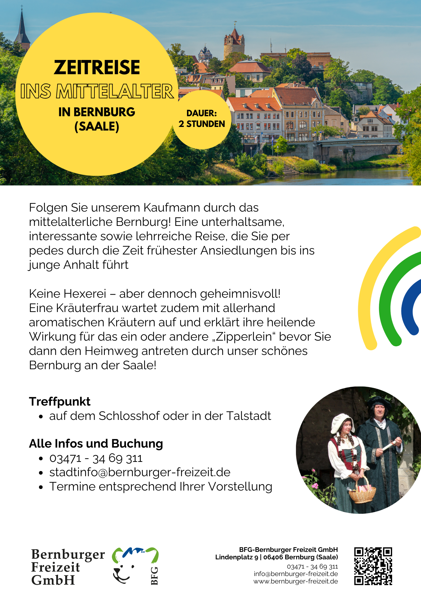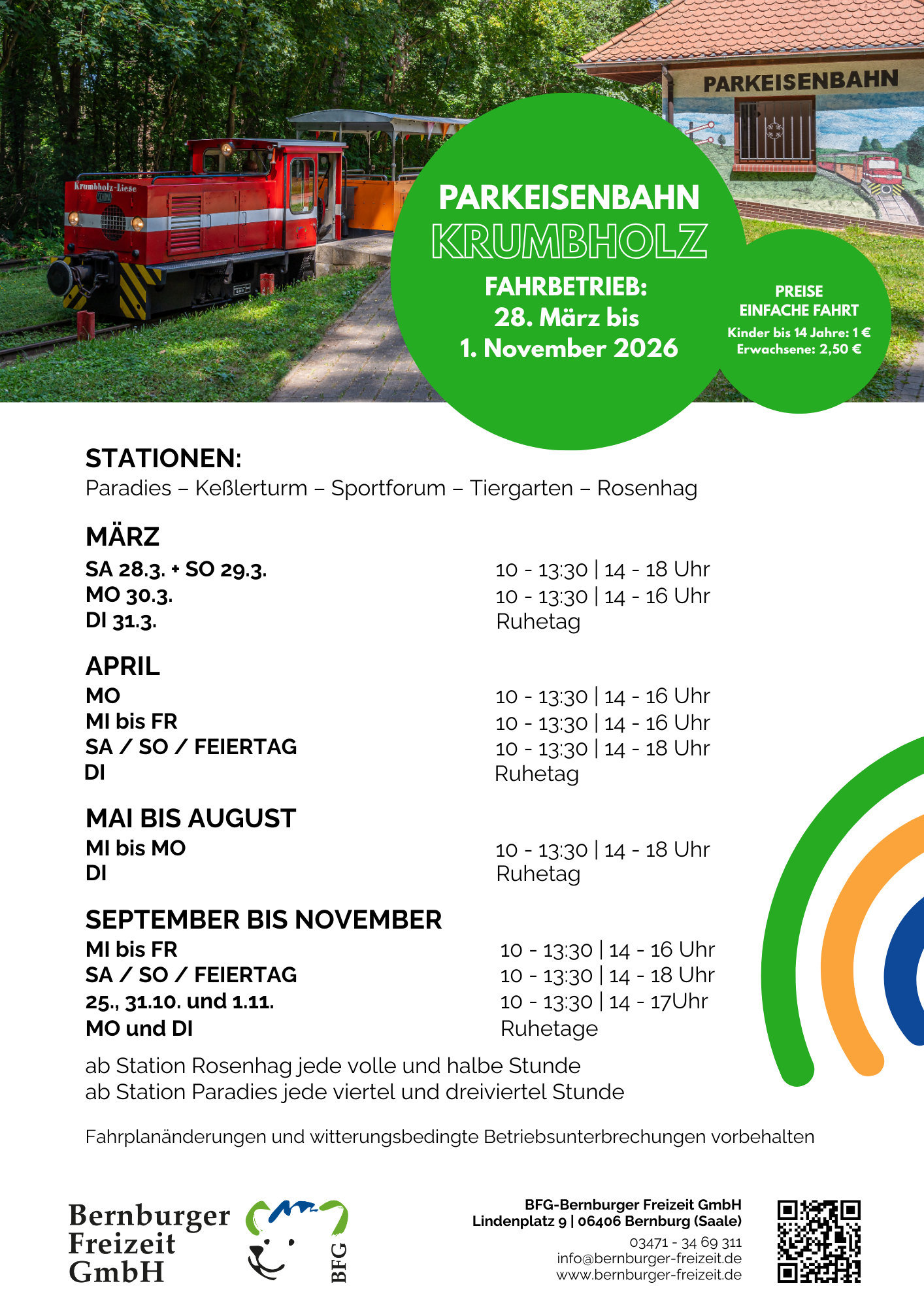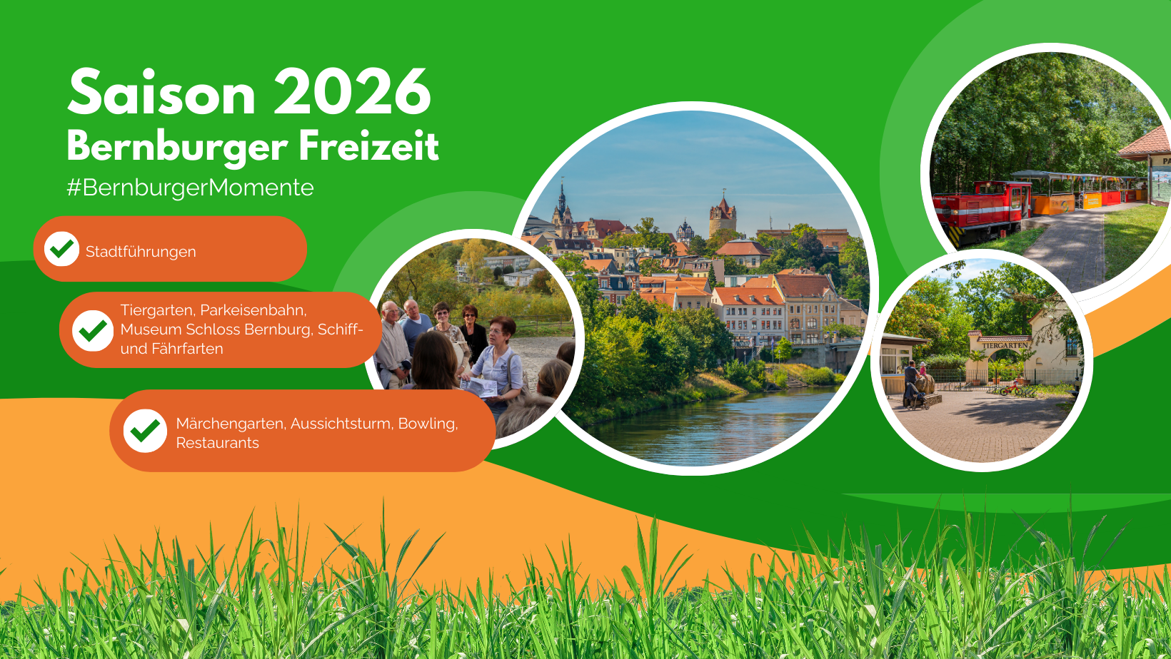 Wir freuen uns auf eine bunte, erlebnisreiche Saison 2026! Wir starten am 28.3. – endlich wieder Krumbholz-Bahn fahren, den Keßlerturm besteigen, länger im Märchengarten Paradies und im Tiergarten verweilen. Wie wäre es mit einer Fahrt mit der MS Saalefee oder unserer Fähre Einheit? Oder aber ihr kommt zu unseren Stadtführungen – auch barrierearm möglich! Und am Ende wartet das Schloss mit unserem Museum Schloss Bernburg. Wir freuen uns auf euren Besuch bei uns. Alle Infos findet ihr auf dieser Webseite und natürlich auch drüben bei Instagram und Facebook.